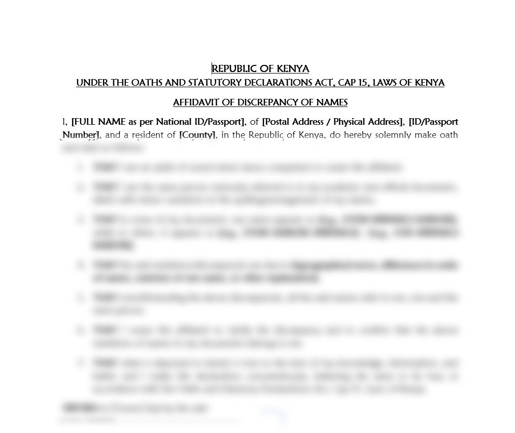 An Affidavit of Discrepancy of Names is a sworn statement used to clarify differences or variations in the spelling, order, or format of a person’s name across official documents. It helps confirm that the differing names refer to the same individual. This affidavit is often required in legal, financial, academic, or immigration processes to avoid confusion and ensure smooth verification. It must be sworn before a Commissioner for Oaths or Notary Public.