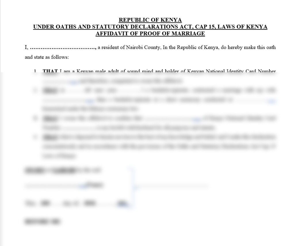 An Affidavit of Proof of Marriage is a sworn statement confirming that a valid marriage exists between two individuals. It is commonly used in situations where an official marriage certificate is unavailable, lost, or insufficient for certain legal, immigration, or administrative purposes. The affidavit is typically sworn before a Commissioner for Oaths or Notary Public and serves as legally recognized evidence of the marital relationship.