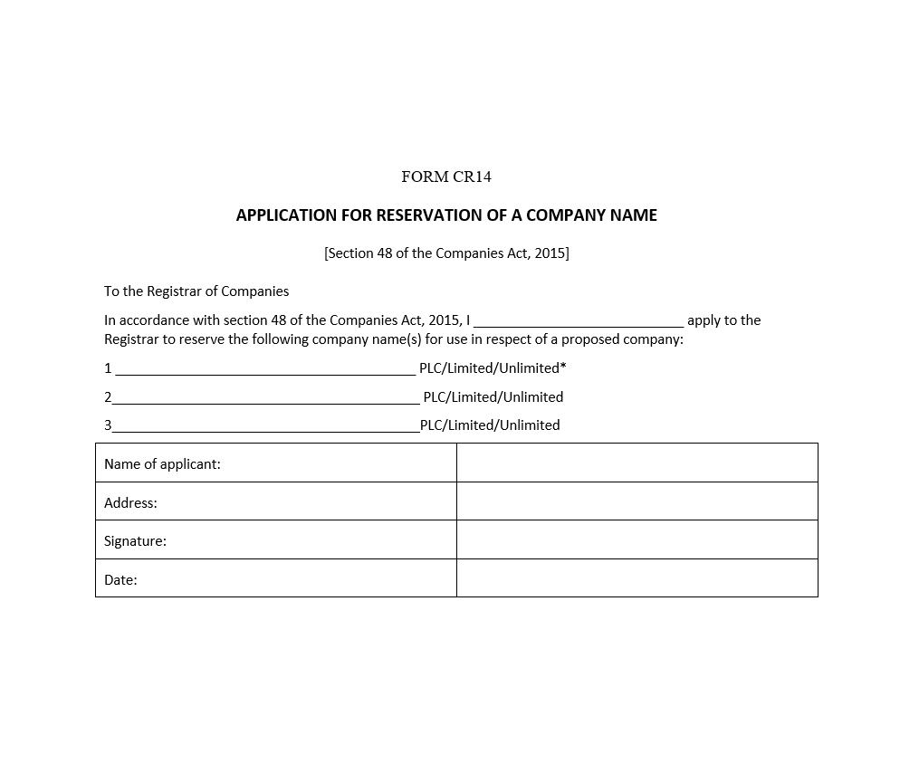 Application for Reservation of a Company Name – [Section 48 of the Companies Act, 2015] – Form CR 14