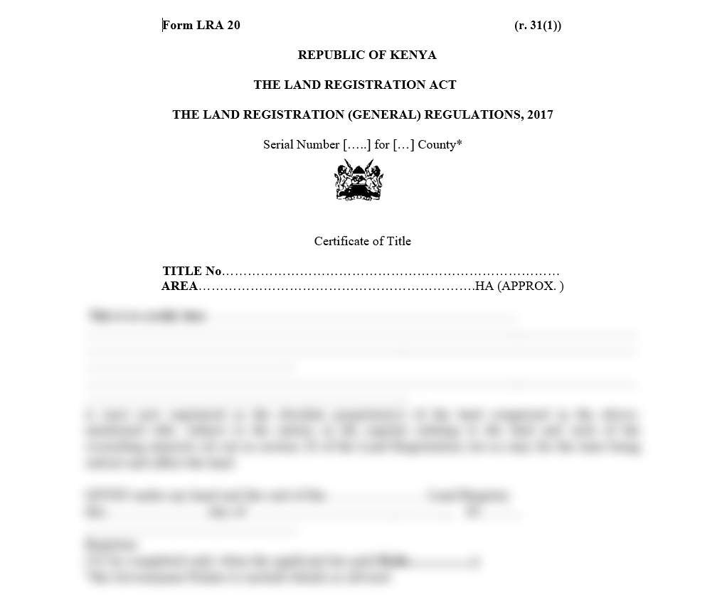 The Certificate of Title (LRA-20) is an official document issued by the Land Registrar as conclusive proof of land ownership. It records the registered proprietor’s details, the property description, and any encumbrances or interests affecting the land. This certificate serves as the ultimate evidence of title under the Land Registration Act, affirming the owner’s legal rights over the property.