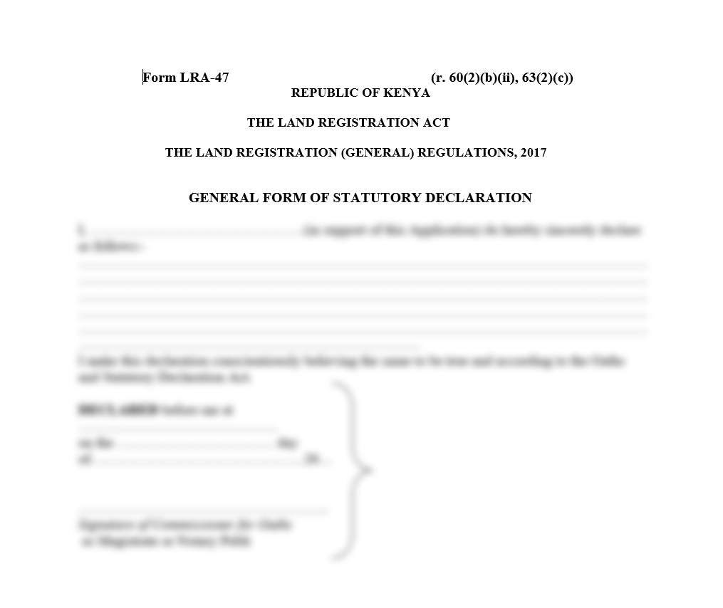 The General Form of Statutory Declaration (Form LRA-47) is a legal document used to make a formal statement of fact in relation to land matters under the Land Registration Act. It is typically sworn before a commissioner for oaths, a magistrate, or a notary public and serves as supporting evidence in land transactions, applications, or disputes where a written affirmation is required to verify truth or authenticity.