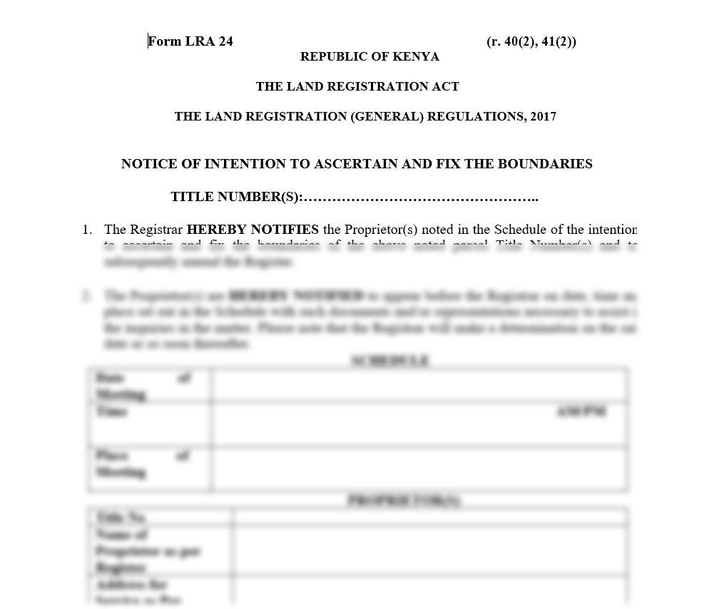 The Notice of Intention to Ascertain and Fix the Boundaries (LRA-24) is an official communication issued by the Land Registrar to inform landowners and interested parties of the planned boundary determination for a specific parcel of land. The notice provides an opportunity for all affected parties to be present or raise objections before the boundaries are officially fixed, ensuring fairness, accuracy, and transparency in the process.