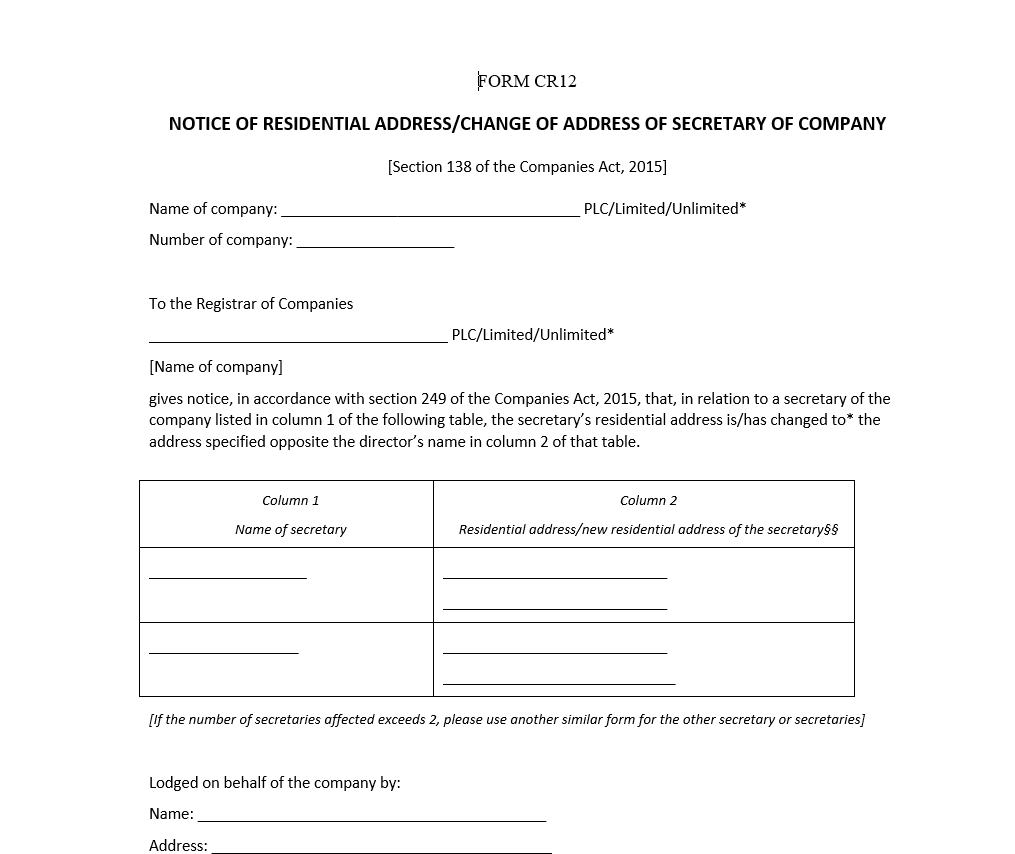 Notice of Residential Address/Change of Address of Secretary of Company – [Section 138 of the Companies Act, 2015] – Form CR12