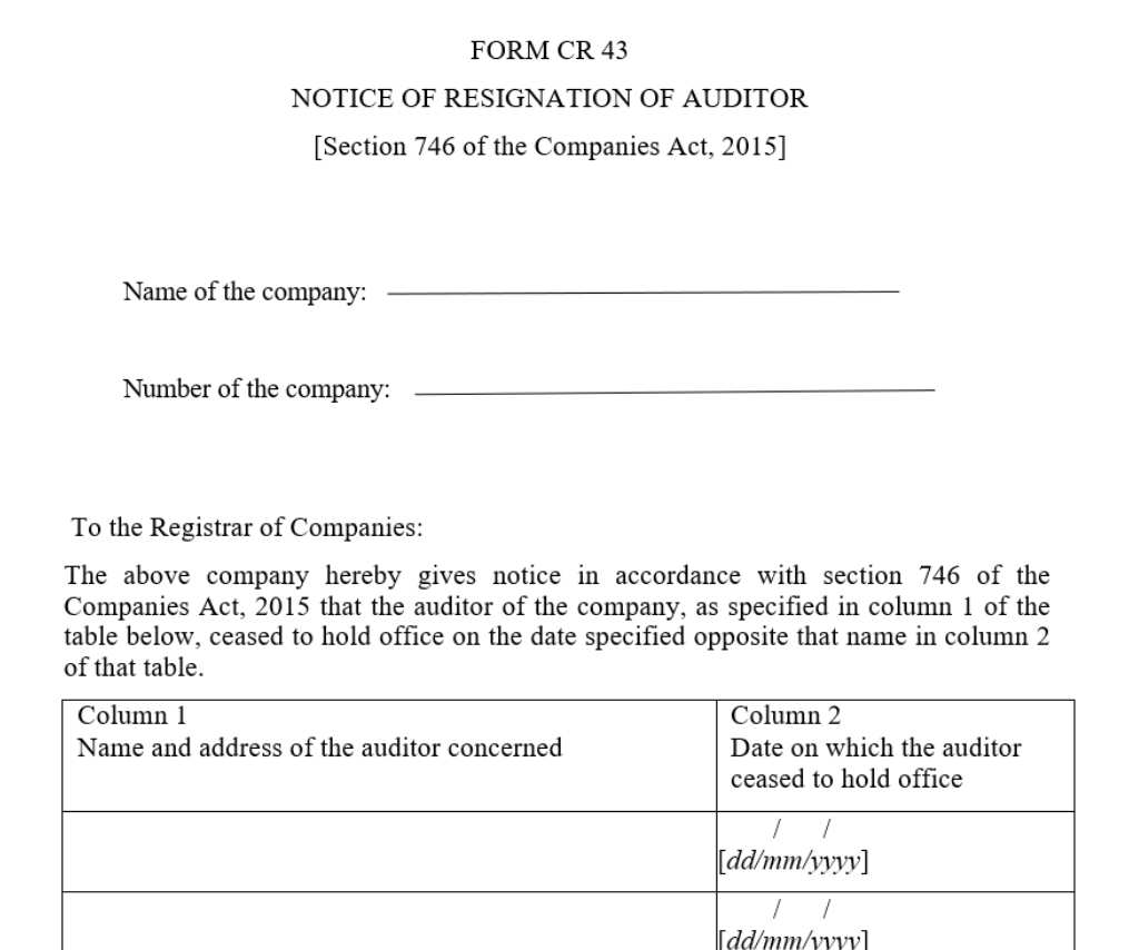 A Notice of Resignation of Auditor – Form CR 43 is a prescribed statutory form used to notify the Registrar of Companies of the resignation of a company’s auditor. The notice confirms the cessation of the auditor’s appointment and ensures that the company’s statutory records are updated accordingly in compliance with the Companies Act, 2015.