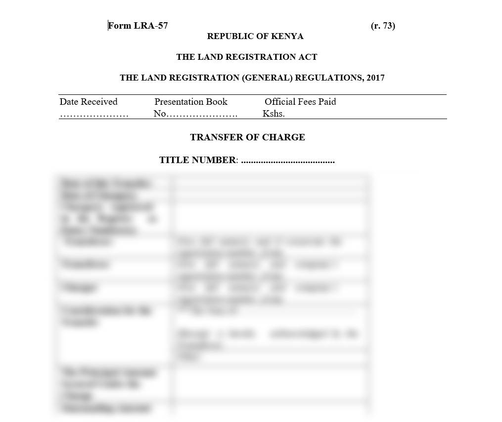 The Transfer of Charge (Form LRA-57) is used to legally transfer the rights and obligations of an existing charge from one lender (chargee) to another. This document ensures that the new chargee is officially recognized in the land register as the rightful holder of the charge, maintaining the continuity and validity of the financial interest over the property.